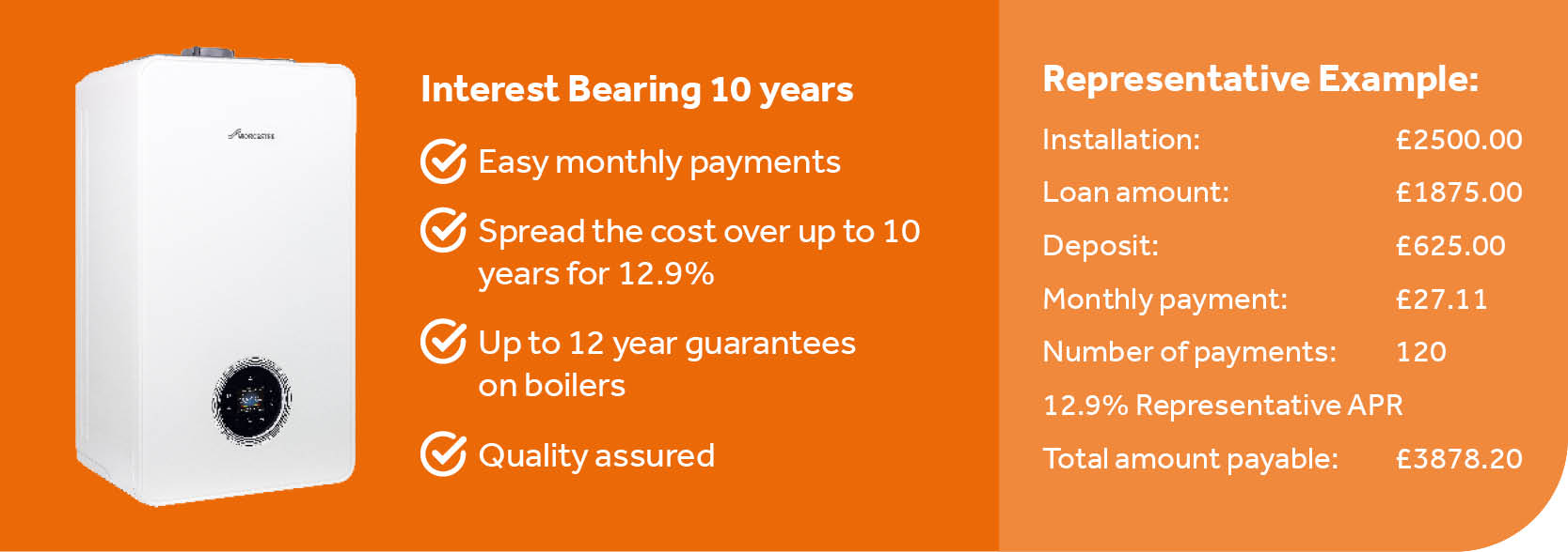 We offer monthly payment options on all Worcester Bosch gas boiler installation. This allows you to spread the cost of a new boiler using interest free credit over terms up to 2 years, or our lower longer monthly payment options of up to 10 years at 12.9% APR – keep your plans and have your new boiler. Working with Worcester Bosch and Novuna Personal Finance all consumer credit products are offer subject to statues and credit check.
